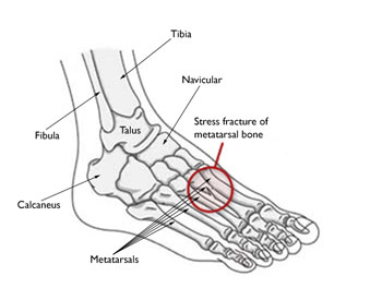 A00379F01.jpg" title="The most common sites for stress fractures in the foot are the metatarsal bones." credit="">Many stress fractures are overuse injuries. They occur over time when repetitive forces result in microscopic damage to the bone. The repetitive force that causes a stress fracture is not great enough to cause an acute fracture — such as a broken ankle caused by a fall. Overuse stress fractures occur when an athletic movement is repeated so often, weight-bearing bones and supporting muscles do not have enough time to heal between exercise sessions.