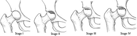 Osteonecrosis can progress from a normal, healthy hip (Stage I) to the collapse of the femoral head (Stage IV).