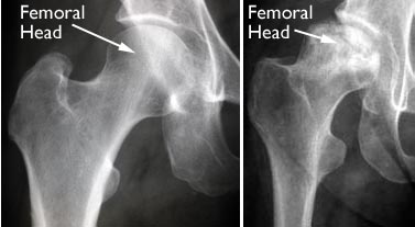(Left) An x-ray of a healthy hip joint. (Right) In this x-ray, the osteonecrosis has progressed to collapse of the femoral head.