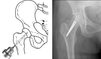 (Left) Core decompression. (Right) In this x-ray, the drill lines show the pathway of small drill holes used in a core decompression procedure.