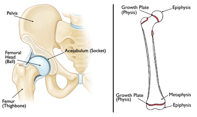 (Left) Normal anatomy of the hip. (Right) The location of the growth plates and epiphyses at the ends of the femur (thighbone). The epiphysis at the upper end of the bone eventually becomes the femoral head.