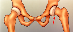 An illustration of SCFE. The femoral head has shifted slightly downward off the neck of the bone through the growth plate (arrow).