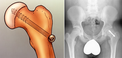 Illustration and x-ray of in situ fixation. A single screw is inserted to prevent any further slip of the femoral head through the growth plate.