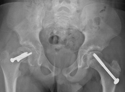 In this x-ray, two screws have been inserted in the patient's right hip to stop progression of a slip. A single screw has been inserted in the left hip to prevent SCFE from developing.
