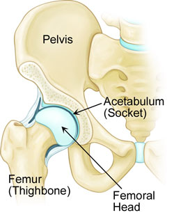 The hip is one of the body's largest joints. It is a ball-and-socket joint. The socket is formed by the acetabulum, which is part of the large pelvis bone. The ball is the femoral head, which is the upper end of the femur (thighbone).