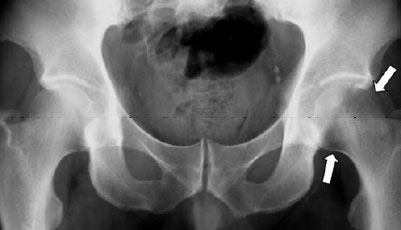 This x-ray of the pelvis shows early changes in bone density in the affected hip (white arrows).