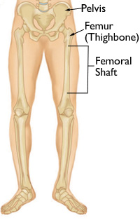 The long, straight part of the femur is called the femoral shaft. When there is a break anywhere along this length of bone, it is called a femoral shaft fracture.