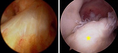 (Left) Arthroscopic picture of the normal ACL. (Right) Arthroscopic picture of torn ACL [yellow star].