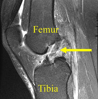 MRI of complete ACL tear. The ACL fibers have been disrupted and the ACL appears wavy in appearance [yellow arrow].