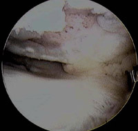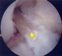 Arthroscopic picture of torn medial meniscus in chronically ACL-deficient knee. In this case, the torn meniscus is pushed forward [yellow star] and locked in front of the knee [called a "bucket handle" meniscus tear], so the patient could not straighten out the leg.