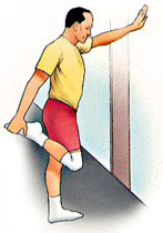 Standing with the involved knee bent, gently pull heel toward buttocks, feeling a stretch in the front of the leg. Hold for 5 seconds.