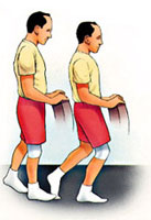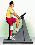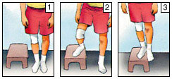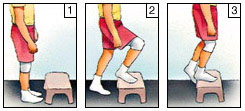 Step up onto a 6-inch high stool, leading with your involved leg. Step down, returning to the starting position. Increase the height of the platform as strength increases.