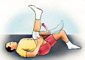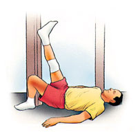 Lie on your back, with your uninvolved knee bent. Straighten your other knee with a quadriceps muscle contraction. Now, slowly raise your leg until your foot is about 12 inches from the floor. Slowly lower it to the floor and relax.