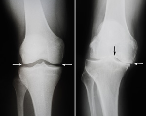 (Left) In this x-ray of a normal knee, the space between the bones indicates healthy cartilage (arrows). (Right) This x-ray of a knee that has become bowed from arthritis shows severe loss of joint space (arrows).