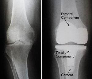 (Left) Severe osteoarthritis. (Right) The arthritic cartilage and underlying bone has been removed and resurfaced with metal implants on the femur and tibia. A plastic spacer has been placed in between the implants. The patellar component is not shown for clarity.