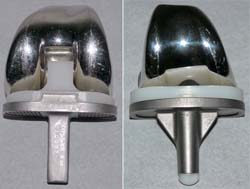 (Left) An x-ray of a severely arthritic knee. (Right) The x-ray appearance of a total knee replacement. Note that the plastic spacer inserted between the components does not show up in an x-ray.