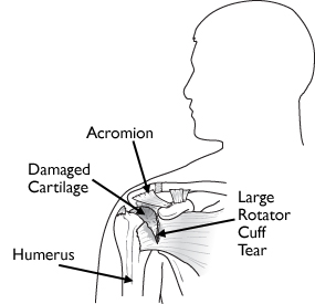 Arthritis can also develop after a large, long-standing rotator cuff tendon tear. The torn rotator cuff can no longer hold the head of the humerus in the glenoid socket, and the humerus can move upward and rub against the acromion. This can damage the surfaces of the bones, causing arthritis to develop.
