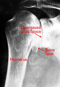 X-rays of an arthritic shoulder will show a narrowing of the joint space, changes in the bone, and the formation of bone spurs (osteophytes).