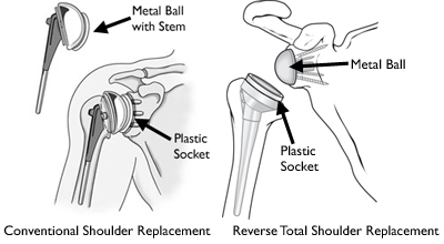 (Left) A conventional total shoulder replacement (arthroplasty) mimics the normal anatomy of the shoulder. (Right) In a reverse total shoulder replacement, the plastic cup inserts on the humerus, and the metal ball screws into the shoulder socket.