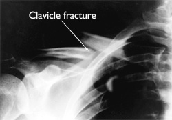 This x-ray shows a fracture in the middle of the clavicle. Note how far out of place the broken ends are.