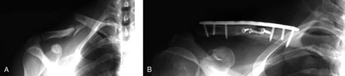 (A) The clavicle is broken in more than one place and the fragments are severely out of alignment. (B)The fractured pieces are held in place by a combination of plates and screws.