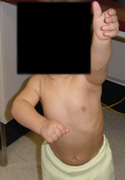 This toddler has brachial plexus birth palsy. It has caused a weakness of the right arm. The child is unable to raise the right arm overhead when reaching for an object.