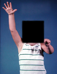 Weakness of the left shoulder, arm, and hand persist in this young child with brachial plexus birth palsy.