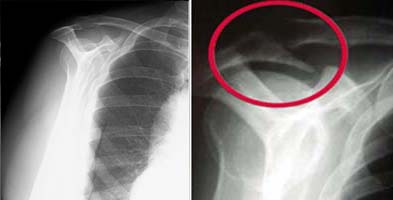 (Left) Normal outlet view x-ray. (Right) Abnormal outlet view showing a large bone spur causing impingement on the rotator cuff.