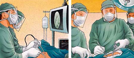 Anterior acromioplasty techniques. (Left) Arthroscopic repair. (Right) Open surgical procedure.