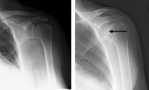 (Left) An x-ray of a healthy shoulder joint. (Right)Osteoarthritis of the shoulder. Note the the decreased joint space in the x-ray (arrow).