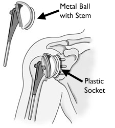The typical total shoulder replacement involves replacing the arthritic joint surfaces with a highly polished metal ball attached to a stem, and a plastic socket.